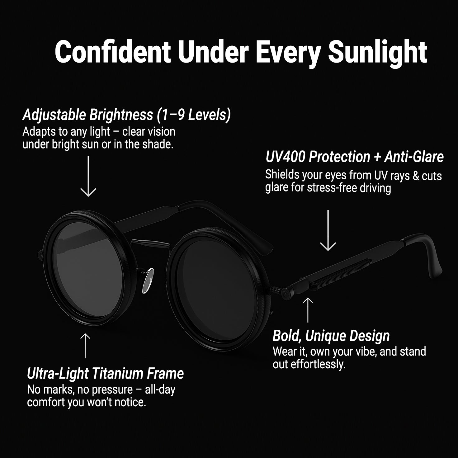"These are hands down the coolest glasses I’ve ever owned! The sleek design constantly gets compliments, and the adjustable filter is a game-changer. Whether I’m driving or just out and about, they perfectly combine style and functionality."